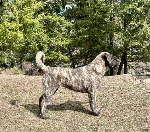 Daisy Mae is an agile girl with an engaged demeanour. Although she is still young, she has already modeled great guardian skills and often follows the livestock around the pasture. She has great agility and is the first one to greet us or respond to an obedience command. Daisy Mae is assertive and fierce towards predators, yet is very submissive towards us. She brings forth a dark brindle colouring and excellent conformation. Her pedigree showcases a desirable lineage of working and conformationally-sound Anatolians. In fact, her mom won 'Best of Breed' in 2024!